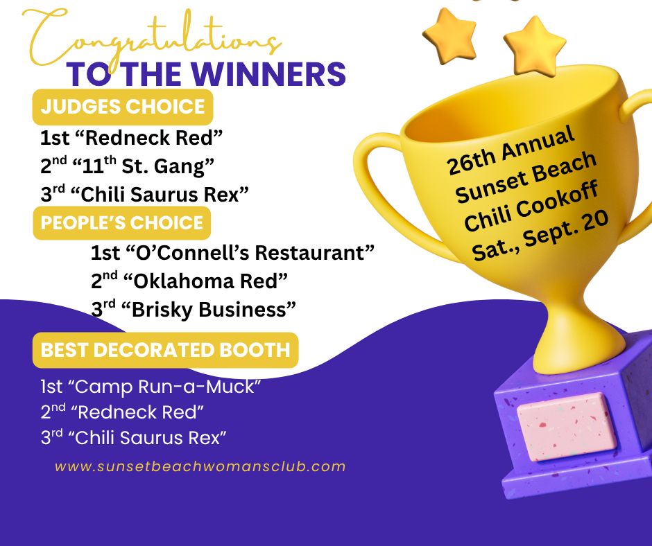 The Sunset Beach Woman’s Club Annual Chili Cook-Off is our biggest fundraiser and a beloved community tradition! This fiery competition brings together talented chili chefs, local businesses, and community members for a day filled with delicious food, live entertainment, and friendly rivalry. All proceeds from the event support our scholarship program and community initiatives.